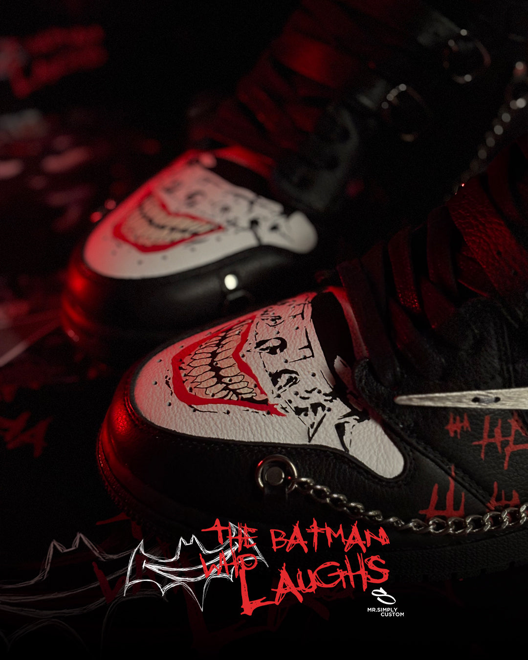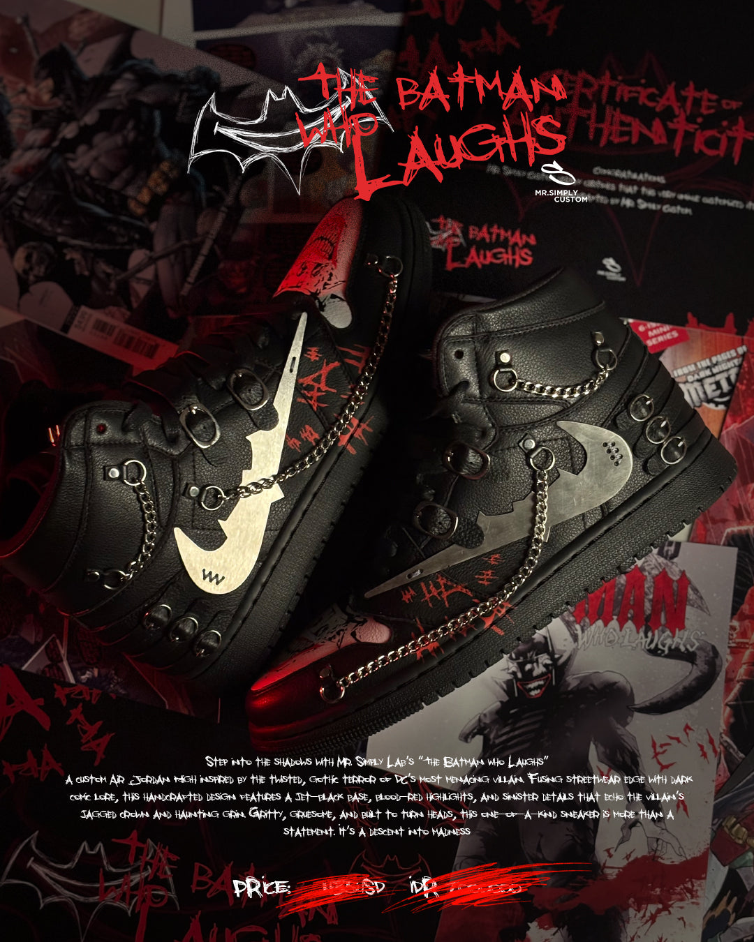 a custom Air Jordan High inspired by the twisted, gothic terror of DC’s most menacing villain. Fusing streetwear edge with dark comic lore, this handcrafted design features a jet-black base, blood-red highlights, and sinister details that echo the villain’s jagged crown and haunting grin. Gritty, gruesome, and built to turn heads, this one-of-a-kind sneaker is more than a statement. It’s a descent into madness