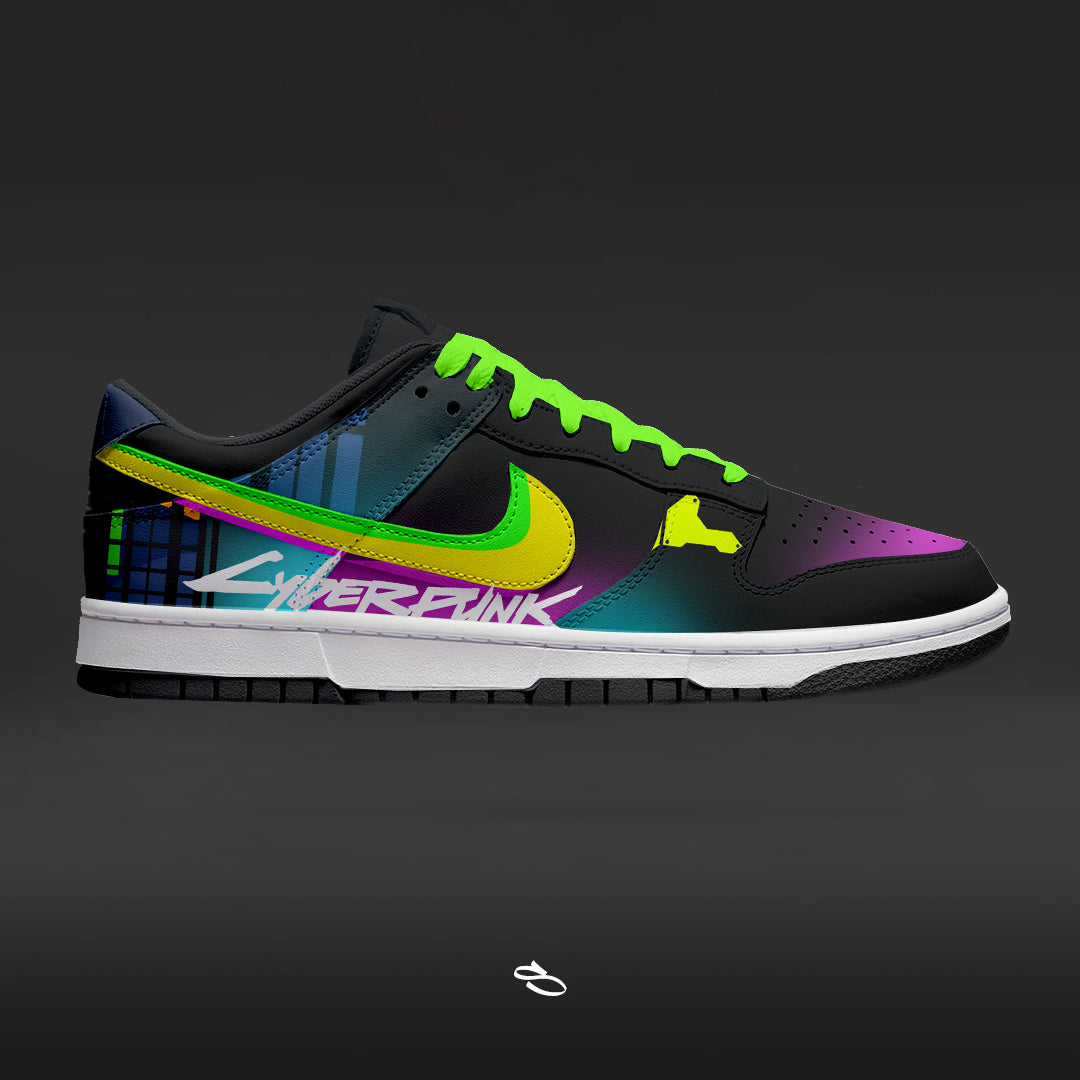 Introducing the Cyberpunk - a unique and stylish custom design of the classic Nike Air Force 1. With intricate details inspired by the popular franchise, this shoe is sure to make a statement. Enjoy the comfort and functionality of Nike while proudly displaying - Cyberpunk.