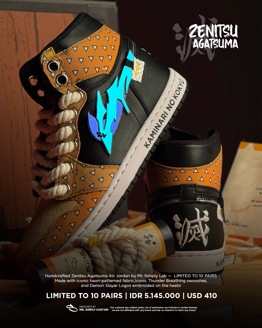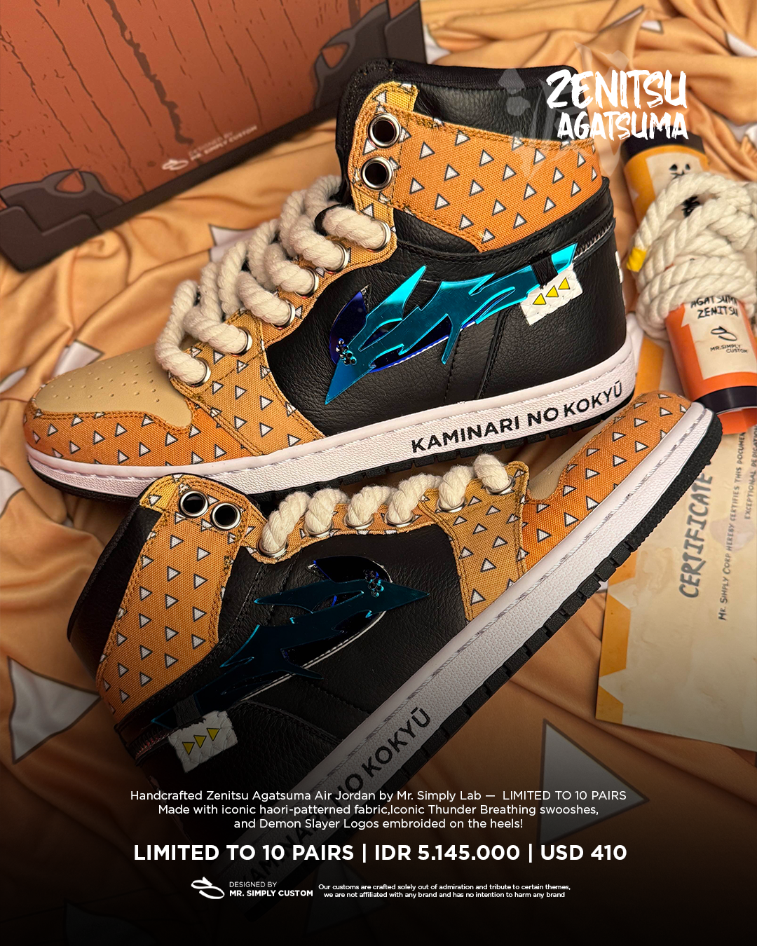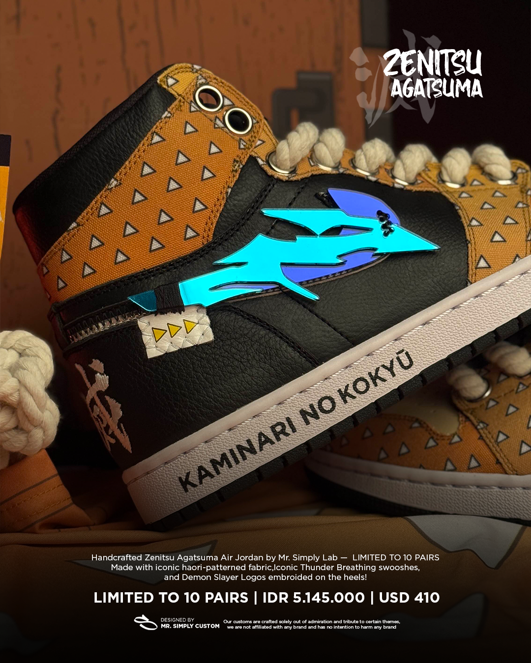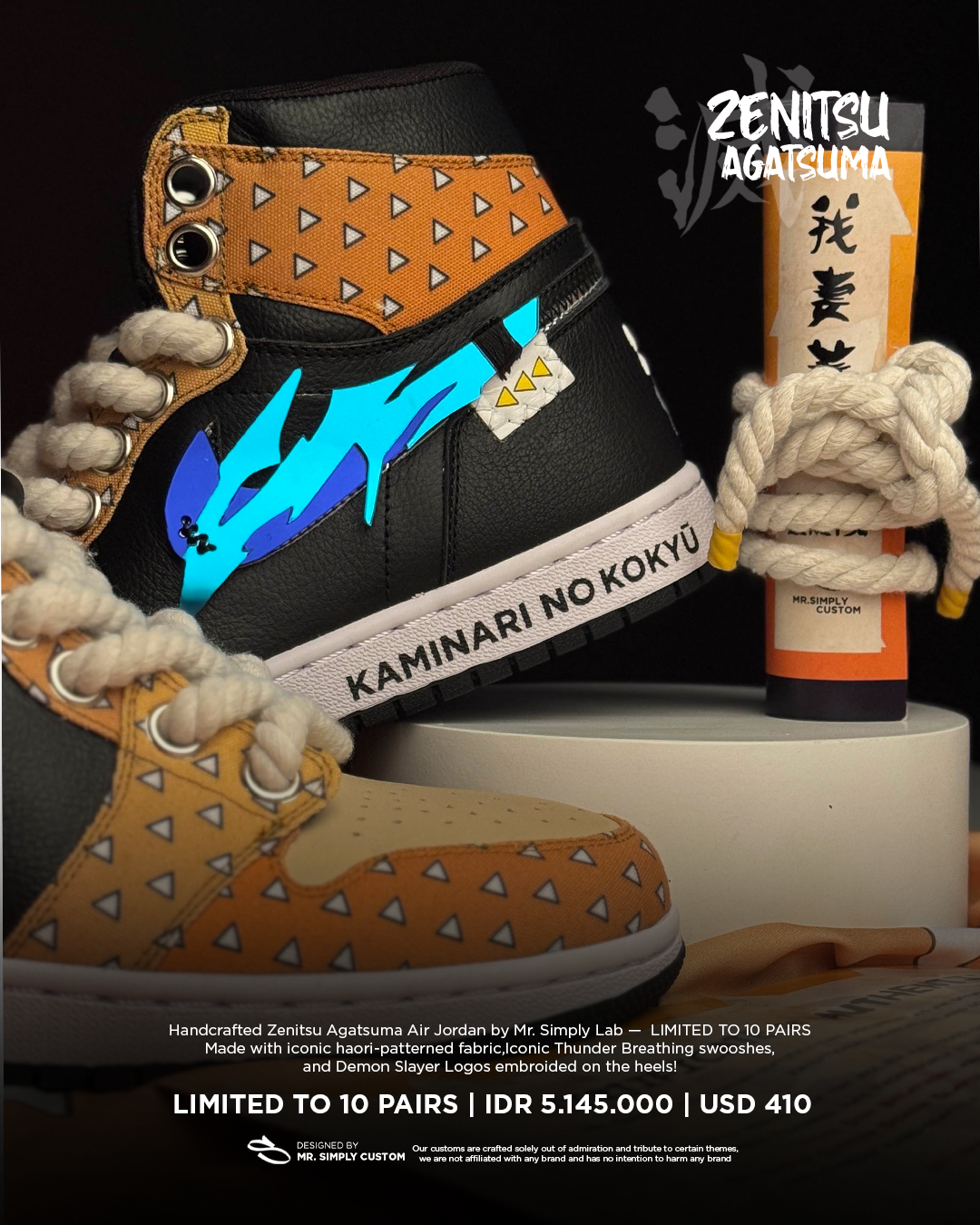 Step into the realm of heroes with the Demon Slayer – Zenitsu Agatsuma Jordan High, a one-of-a-kind sneaker that fuses anime legacy with premium streetwear design. Crafted by Mr. Simply Lab, this custom creation pays tribute to Zenitsu Agatsuma, the beloved character of Demon Slayer, while embodying the timeless silhouette of the Jordan High.