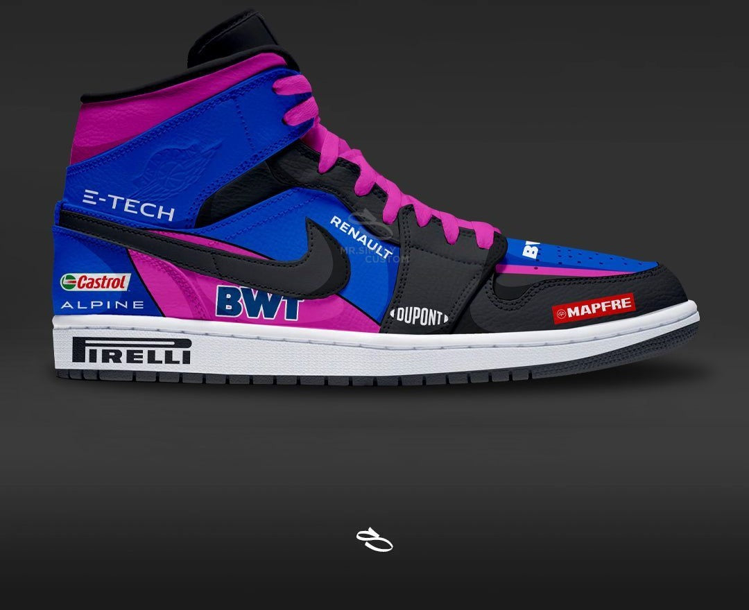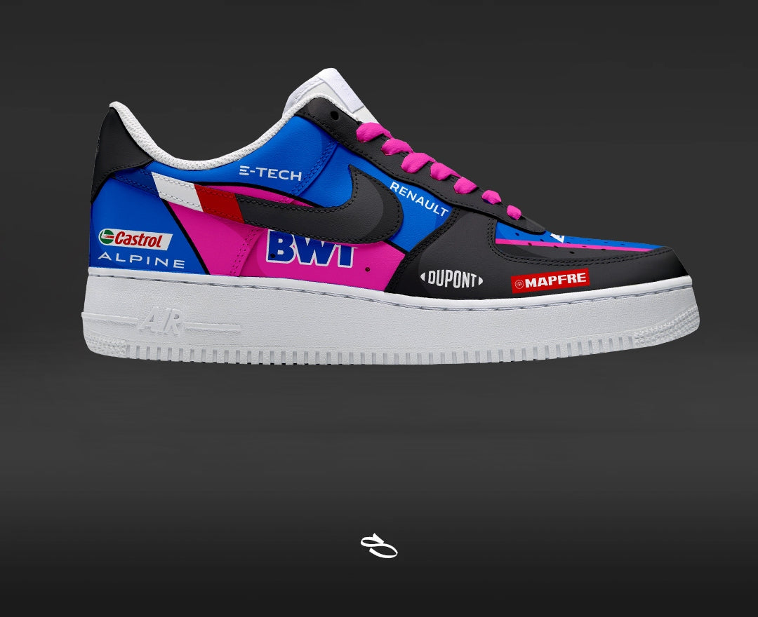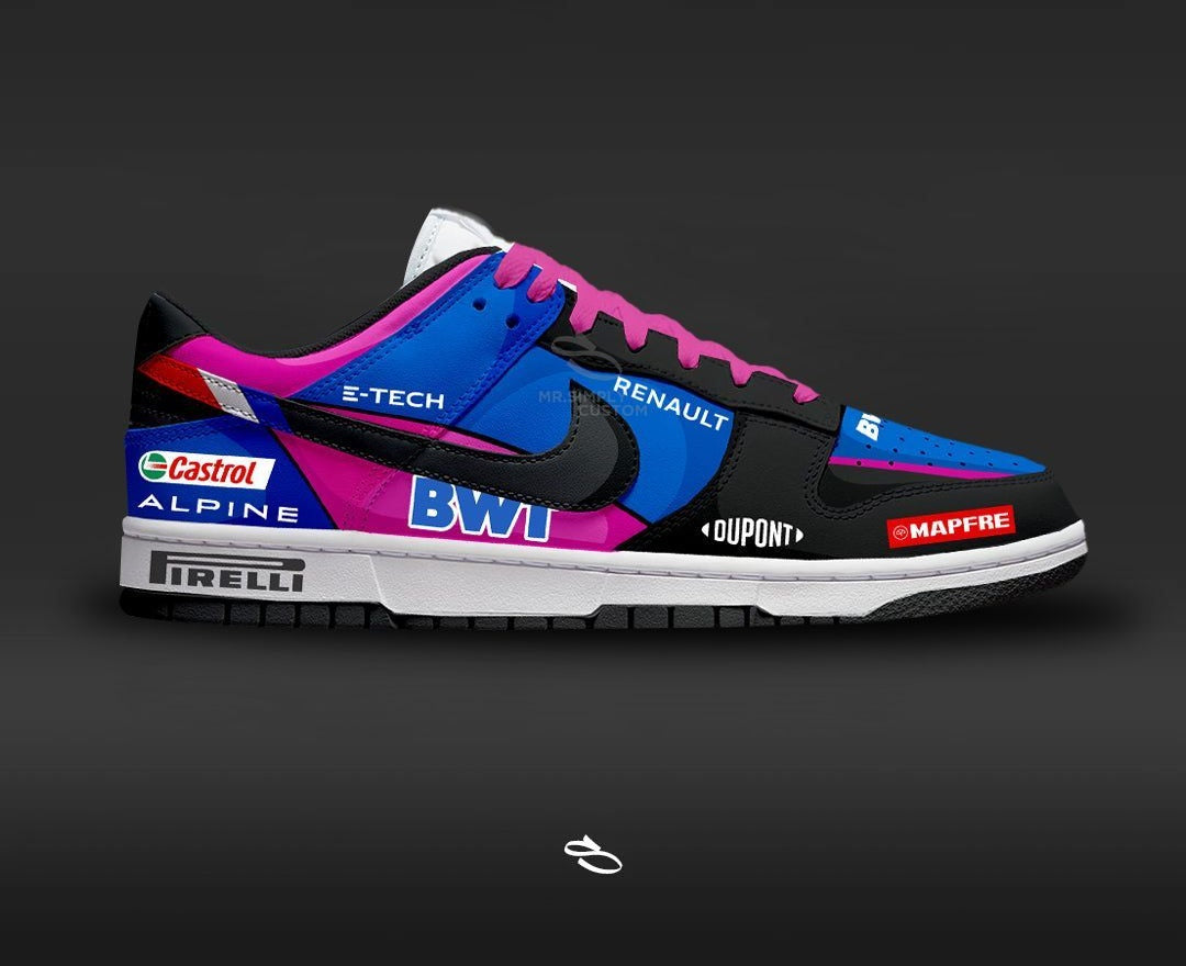 Introducing the F1 ALPINE - a unique and stylish custom design of the classic Dunk low & Air Jordan 1. With intricate details inspired by the popular F1 LIVERY, this shoe is sure to make a statement. Enjoy the comfort and functionality of Nike while proudly displaying F1 ALPINE