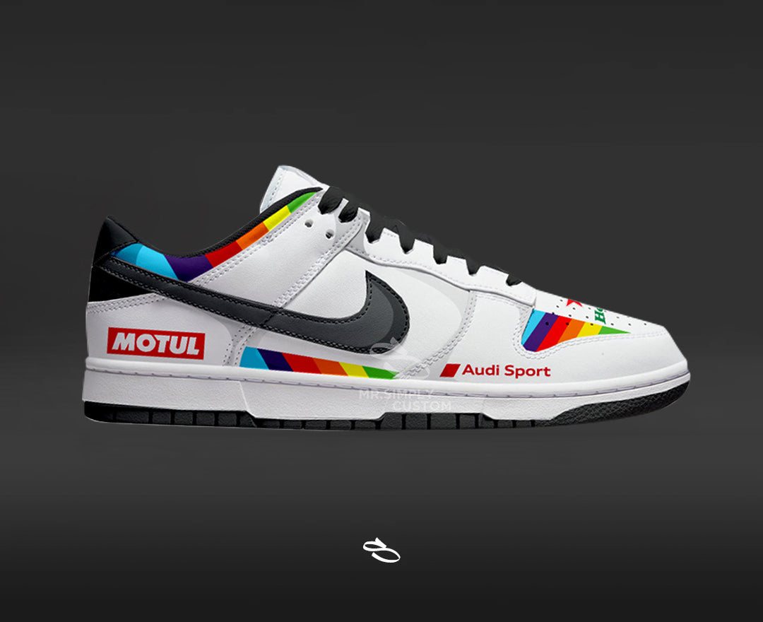 Introducing the Gran Turismo - a unique and stylish custom design of the classic Dunk low. With intricate details inspired by the popular movie series, this shoe is sure to make a statement. Enjoy the comfort and functionality of Nike while proudly displaying Gran Turismo.