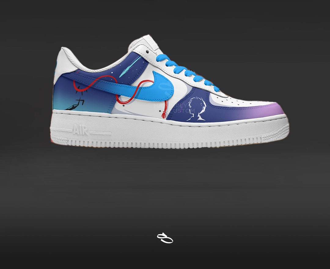 Introducing the Kimi No Nawa - a unique and stylish custom design of the classic Nike Air Force 1. With intricate details inspired by the popular anime series, this shoe is sure to make a statement. Enjoy the comfort and functionality of Nike while proudly displaying Kimi No Nawa.