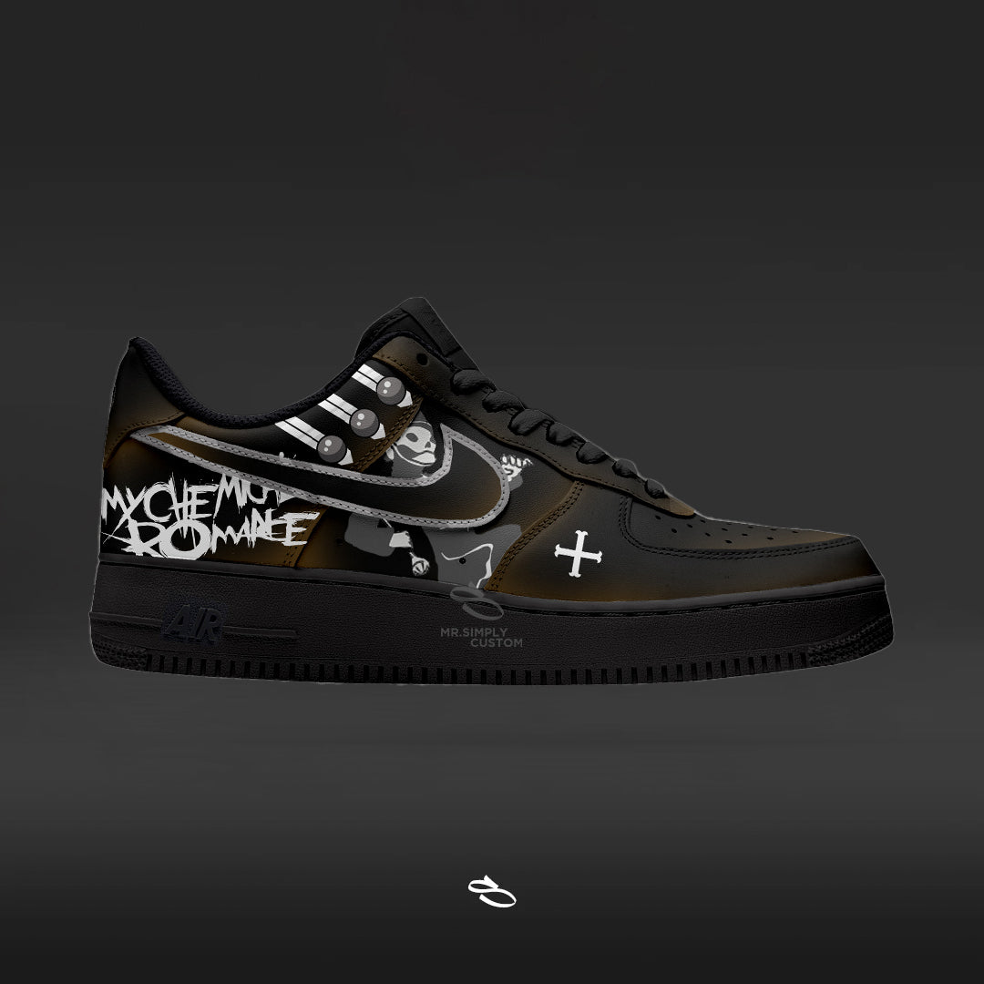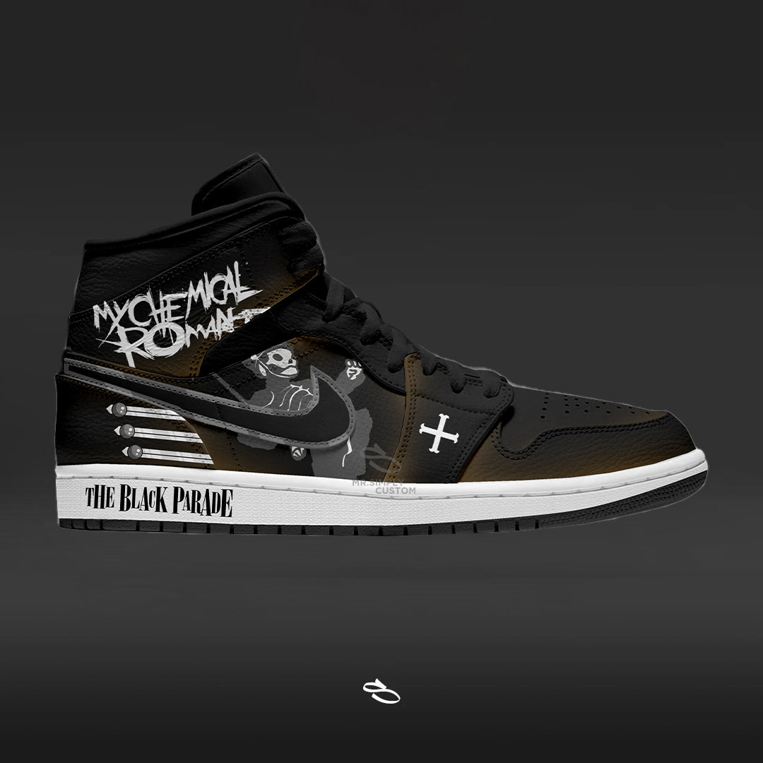 Introducing the My Chemical Romance collections - a unique and stylish custom design of the classic Nike Air Jordan 1. With intricate details inspired by the popular Band, this shoe is sure to make a statement. Enjoy the comfort and functionality of Nike while proudly displaying My Chemical Romance