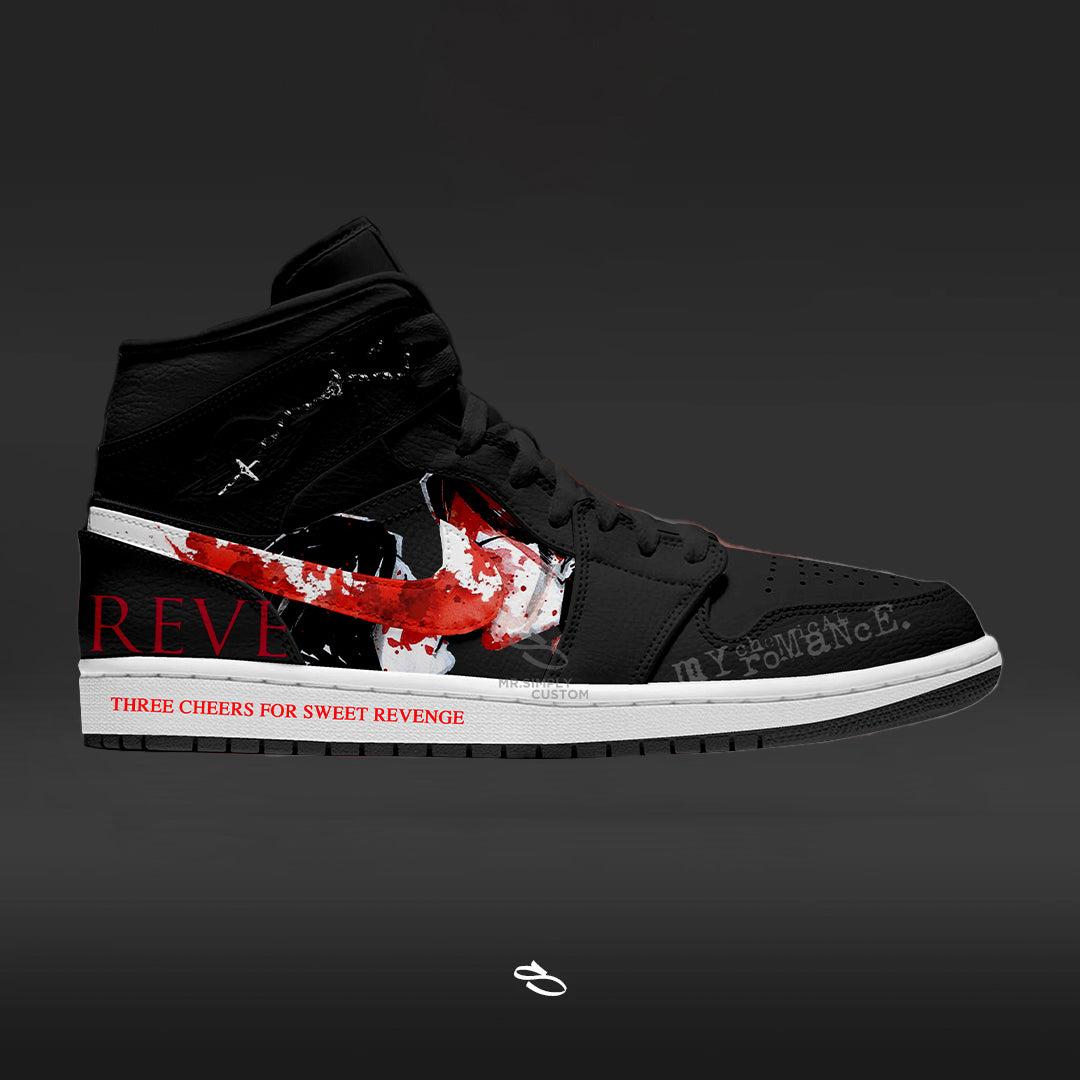 Introducing the My Chemical Romance collections - a unique and stylish custom design of the classic Nike Air Jordan 1. With intricate details inspired by the popular Band, this shoe is sure to make a statement. Enjoy the comfort and functionality of Nike while proudly displaying My Chemical Romance