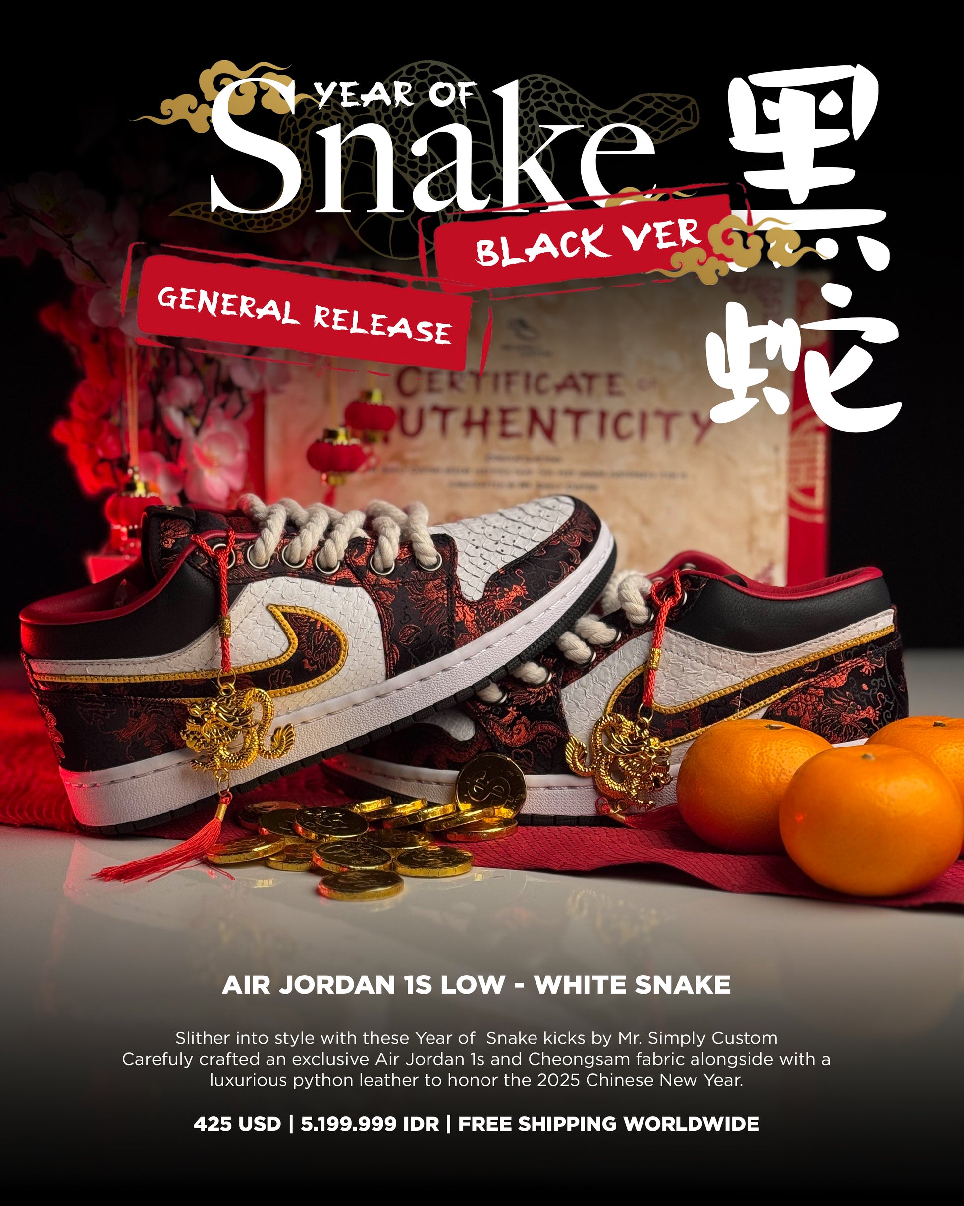 Crafted with premium Python leather and intricately detailed Cheongsam fabric, these sneakers embody the spirit of the Chinese New Year and honor the Year of the Snake. The luxurious textures and bold patterns create a striking fusion of tradition and streetwear, perfect for those who appreciate artistry in every step.
